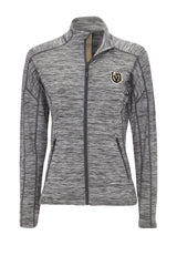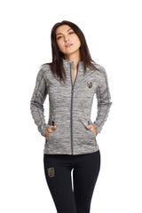 Vegas Knights full zip women's jacket featuring 91% polyester and 9% spandex for a warm, cozy, luxurious feel. This full zip Vegas Knights jacket features stretch knit fabric and zippered front pockets.