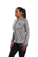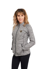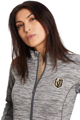 Vegas Knights full zip women's jacket featuring 91% polyester and 9% spandex for a warm, cozy, luxurious feel. This full zip Vegas Knights jacket features stretch knit fabric and zippered front pockets.